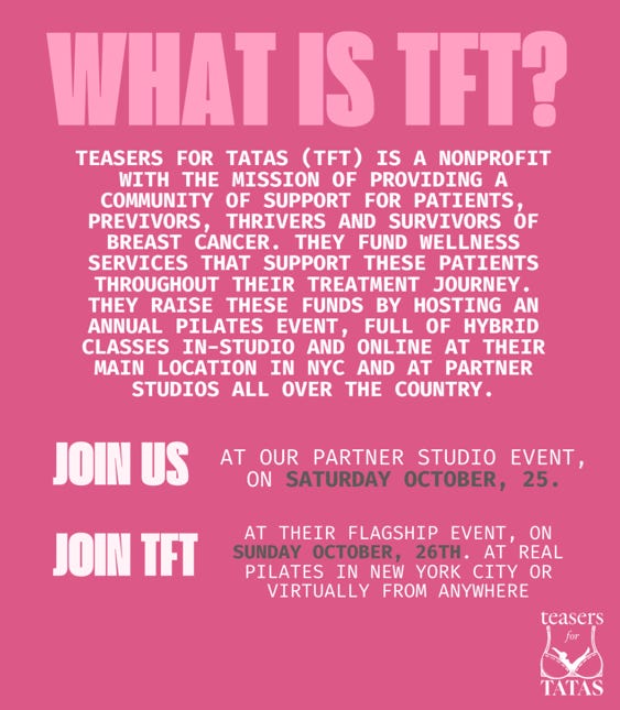 If you are able, please join me this Saturday from 10:00 – 10:45am CST for a virtual Zoom Pilates class led by Pilates with Jill, in collaboration with Teasers for TaTas.